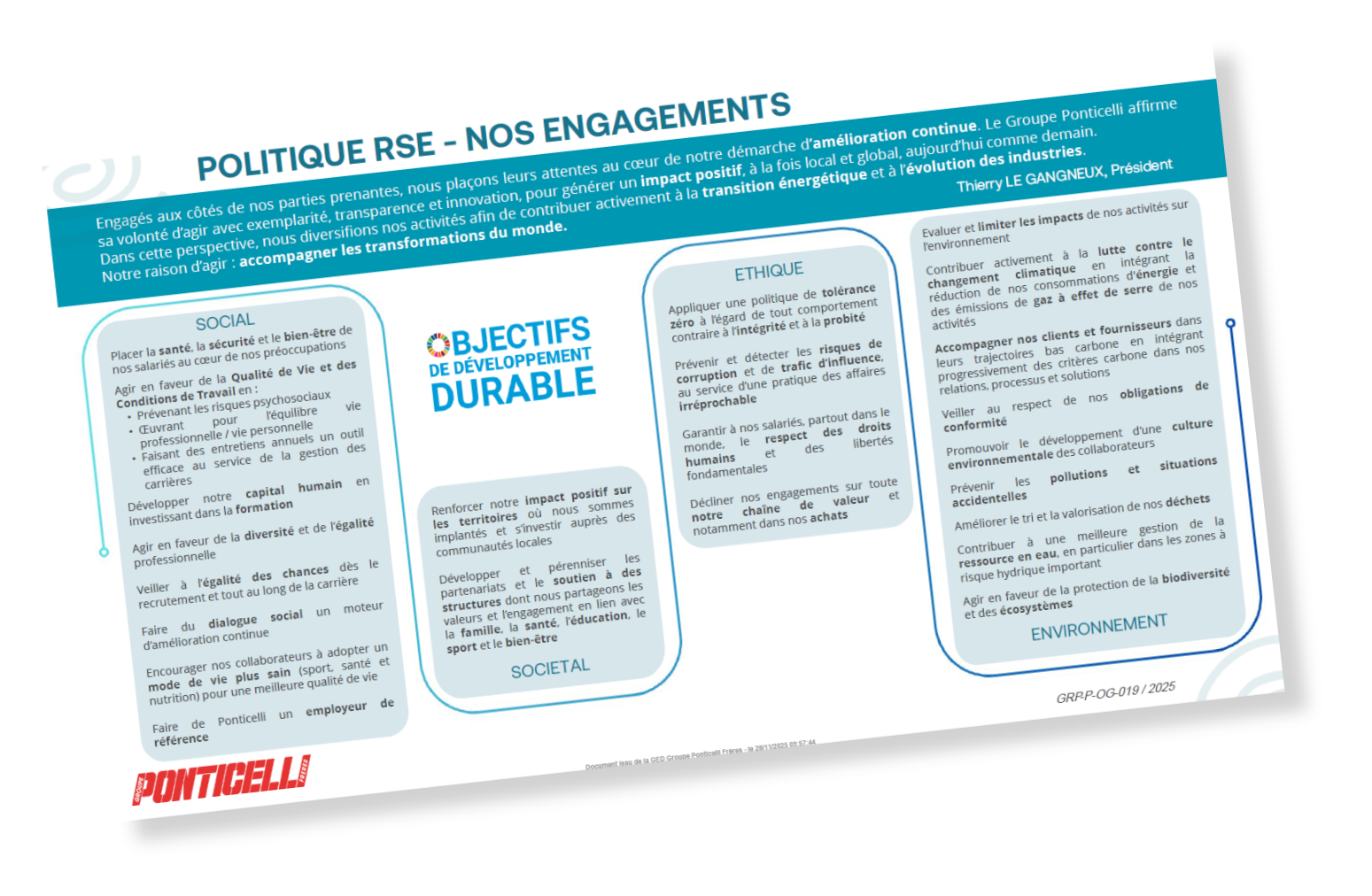 Le Groupe Ponticelli adhère aux principes de la Déclaration Universelle des Droits de l’Homme (DUDH), de l’Organisation Internationale du Travail (OIT) et de l’Organisation de Coopération et de Développement Économique (OCDE).